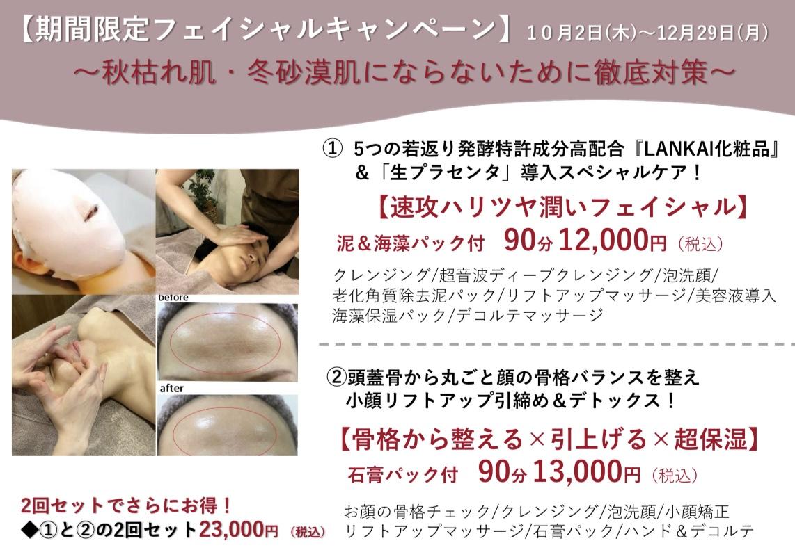 お顔の骨格チェック→小顔矯正→クレンジング→洗顔→リフトアップマッサージ→→石膏パック→デコルテ&ハンドマッサージ→LANKAI化粧品による整肌